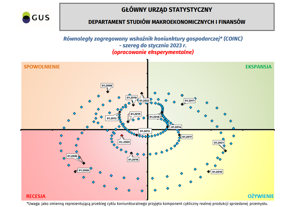 Równoległy oraz wyprzedzający zagregowany wskaźnik koniunktury, zegar koniunktury - szereg do stycznia 2023 r.