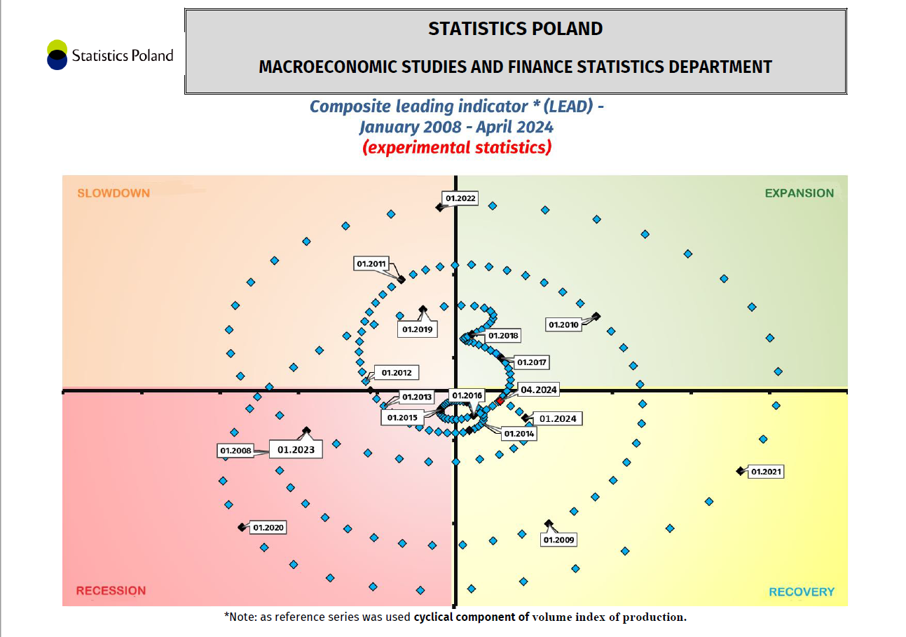 Coincident and leading composite business cycle indicator, business cycle clcock. Series until April 2024