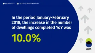 According to preliminary data, in the period January-February of 2018, 29576 dwellings were completed, i.e. by 10.0% more than the year before (in which an increase was noted by 7.5%). Among two main forms of constructions in the housing market better results were recorded by developers who completed 16385 dwellings, i.e. by 11.5% more than the year before (when an increase was recorded by 11.0%), and private investors – 12546 dwellings, i.e. by 10.1% more (against an increase by 4.4% the year before ).