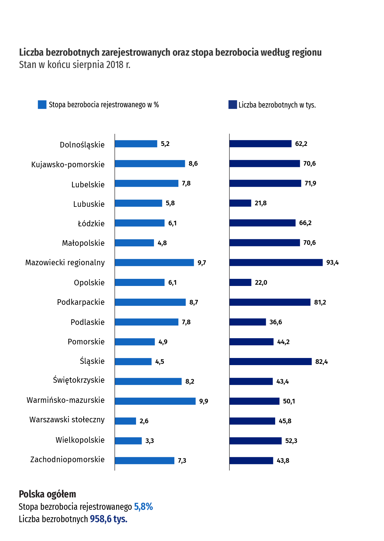 Bezrobotni zarejestrowani i stopa bezrobocia. Stan w końcu sierpnia 2018 r.