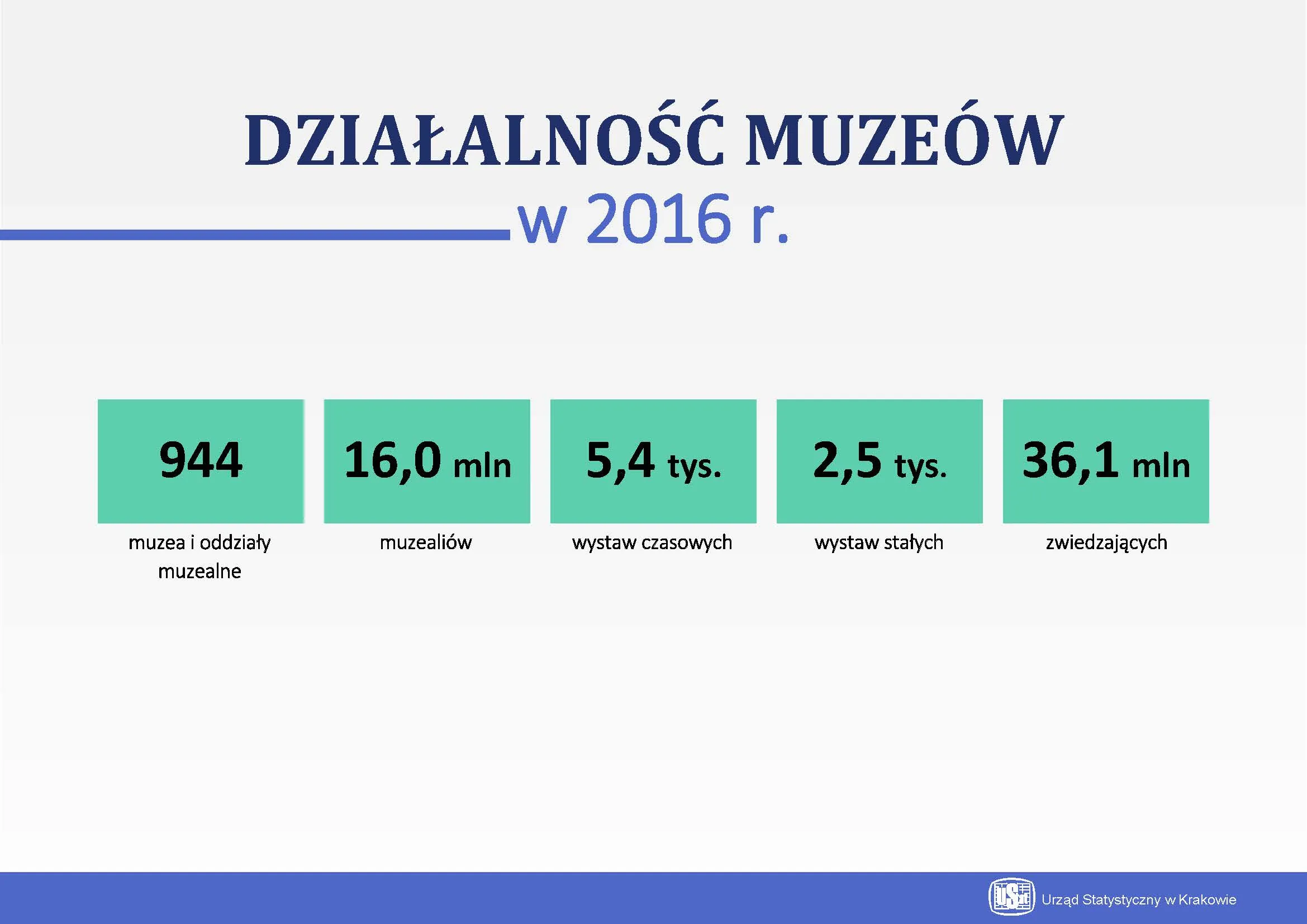Publikacje Dzialalnosc muzeow w 2016 r Działalność muzeów w 2016 r. Kultura Informacja Sygnalna GUS Przejdź do najnowszej wersji 06.07.2017 Usuń z ulubionych Dodaj do ulubionych Częstotliwość wydania Roczna Informacja o działalności muzeów w 2016 r. 6652 Pliki do pobrania Archiwum Dokument pdf Działalność muzeów w 2016 r. 1.03MB 2025 Działalność muzeów w 2025 r. 2024 Działalność muzeów w 2024 r. 2023 Działalność muzeów w 2023 roku 2022 Działalność muzeów w 2022 roku 2021 Działalność muzeów w 2021 roku 2020 Działalność muzeów w 2020 roku 2019 Działalność muzeów w 2019 roku