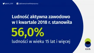 Ludność aktywna zawodowo stanowiła w I kwartale 2018 roku 56,0% ludności w wieku 15 lat i więcej. W porównaniu do IV, jak i I kwartału 2017 roku wskaźnik ten obniżył się o 0,2 p. proc.