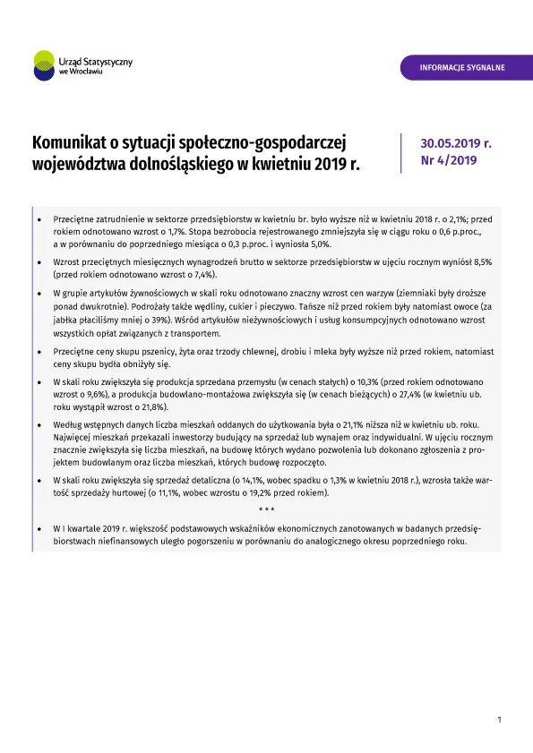 - Komunikat o sytuacji społeczno-gospodarczej województwa dolnośląskiego w maju 2019 r.