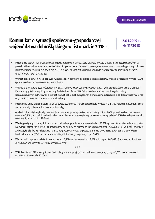 Komunikat o sytuacji społeczno-gospodarczej województwa dolnośląskiego w listopadzie 2018 r.