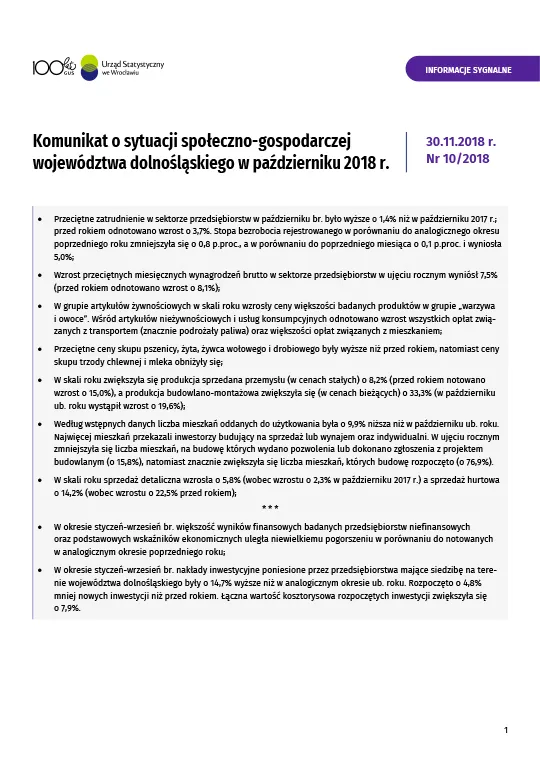 - Komunikat o sytuacji społeczno-gospodarczej województwa dolnośląskiego w listopadzie 2018 r.