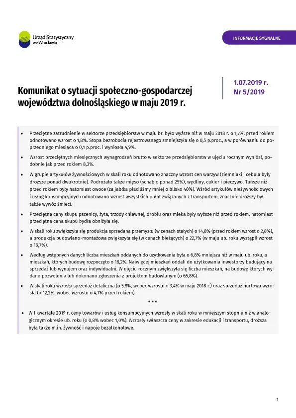 Komunikat o sytuacji społeczno-gospodarczej województwa dolnośląskiego w maju 2019 r.