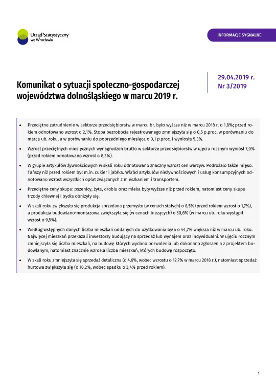- Komunikat o sytuacji społeczno-gospodarczej województwa dolnośląskiego w kwietniu 2019 r.