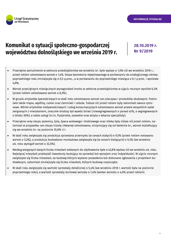 - Komunikat o sytuacji społeczno-gospodarczej województwa dolnośląskiego w październiku 2019 r.