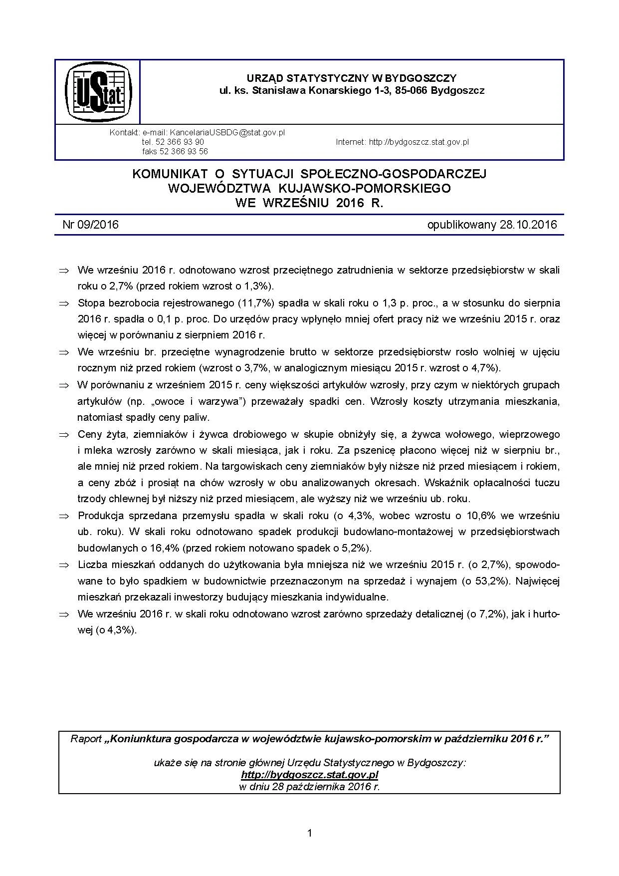 Komunikat o sytuacji społeczno-gospodarczej województwa kujawsko-pomorskiego - wrzesień 2016 r.