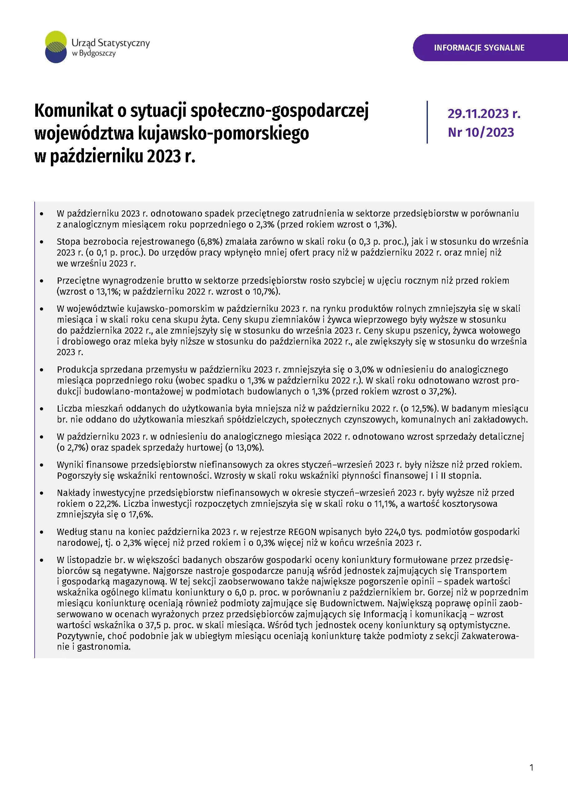- Komunikat o sytuacji społeczno-gospodarczej województwa kujawsko-pomorskiego - listopad 2023 r.