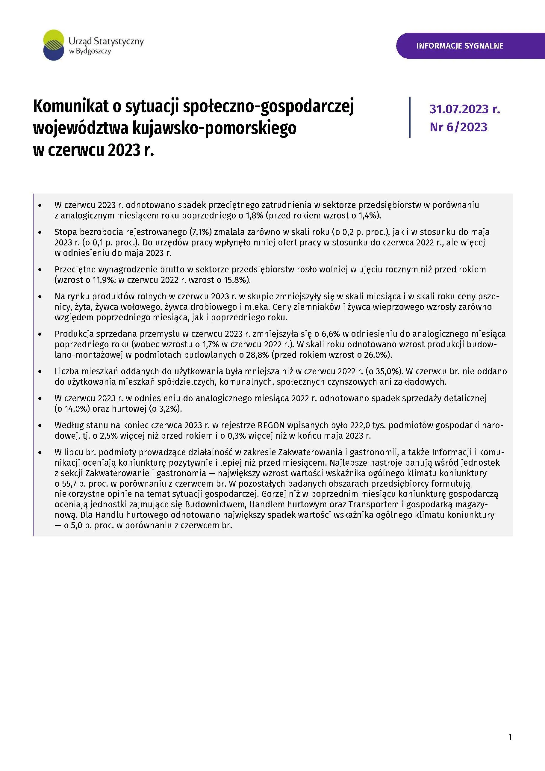 - Komunikat o sytuacji społeczno-gospodarczej województwa kujawsko-pomorskiego - lipiec 2023 r.
