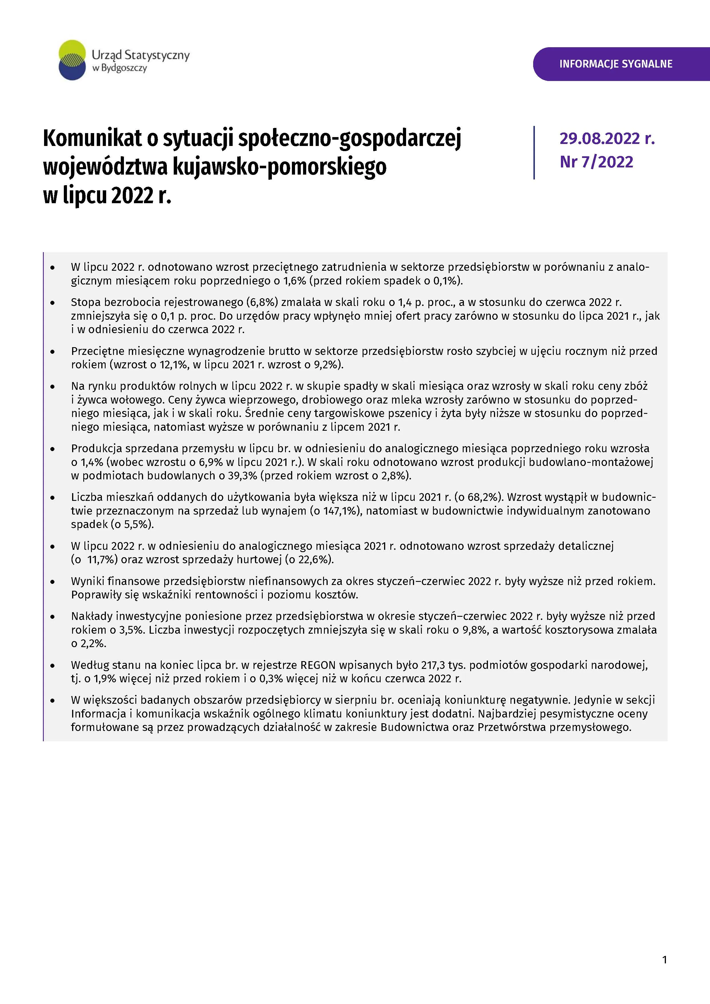 Komunikat o sytuacji społeczno-gospodarczej województwa kujawsko-pomorskiego - lipiec 2022 r.