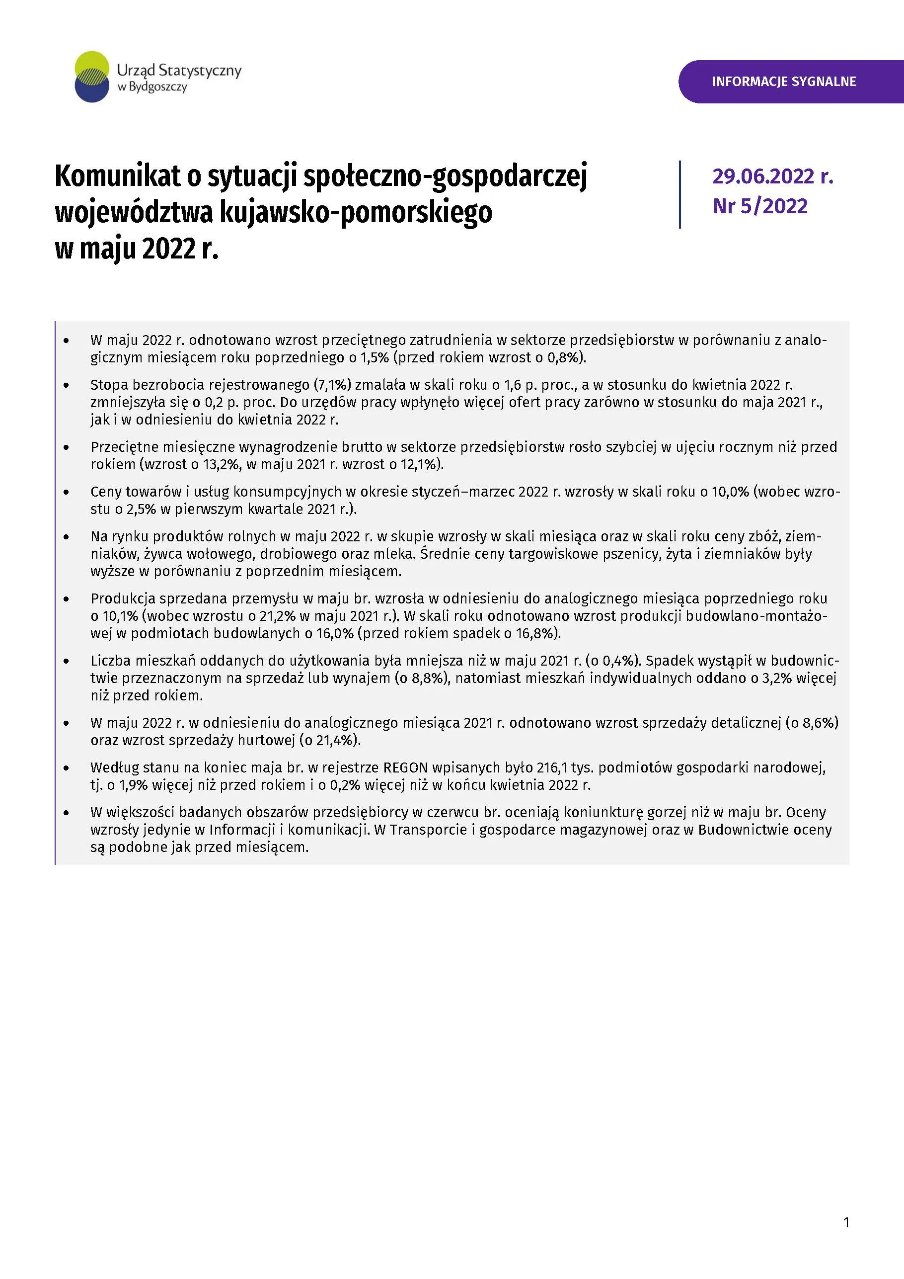 Komunikat o sytuacji społeczno-gospodarczej województwa kujawsko-pomorskiego - maj 2022 r.