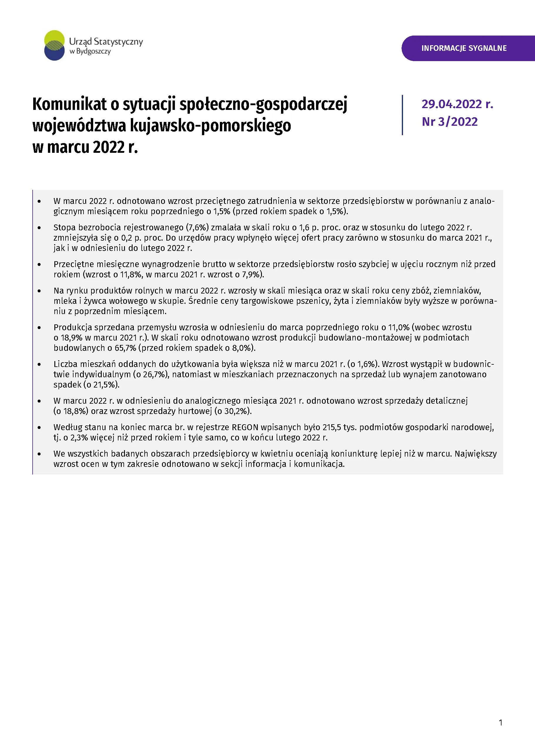 Komunikat o sytuacji społeczno-gospodarczej województwa kujawsko-pomorskiego - marzec 2022 r.