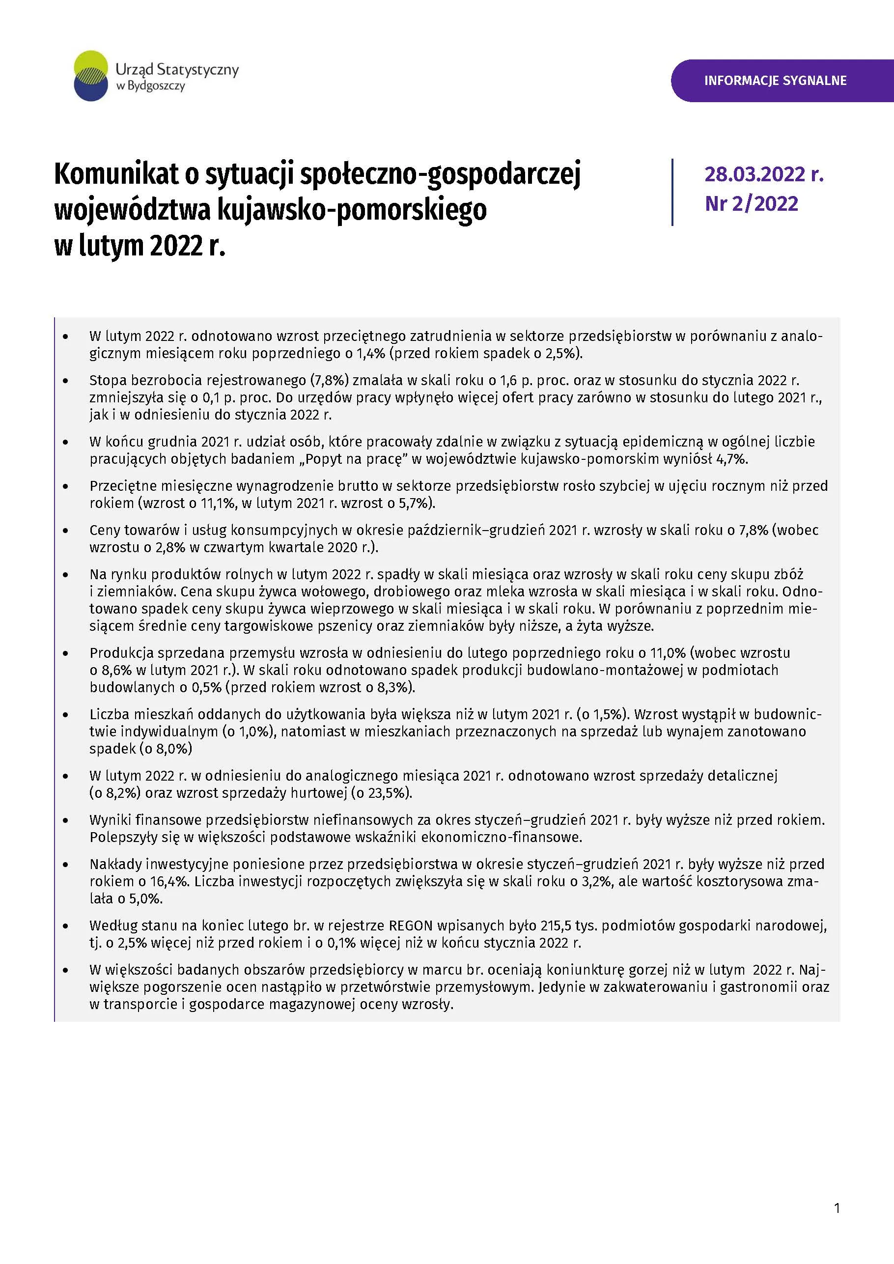 Komunikat o sytuacji społeczno-gospodarczej województwa kujawsko-pomorskiego - luty 2022 r.