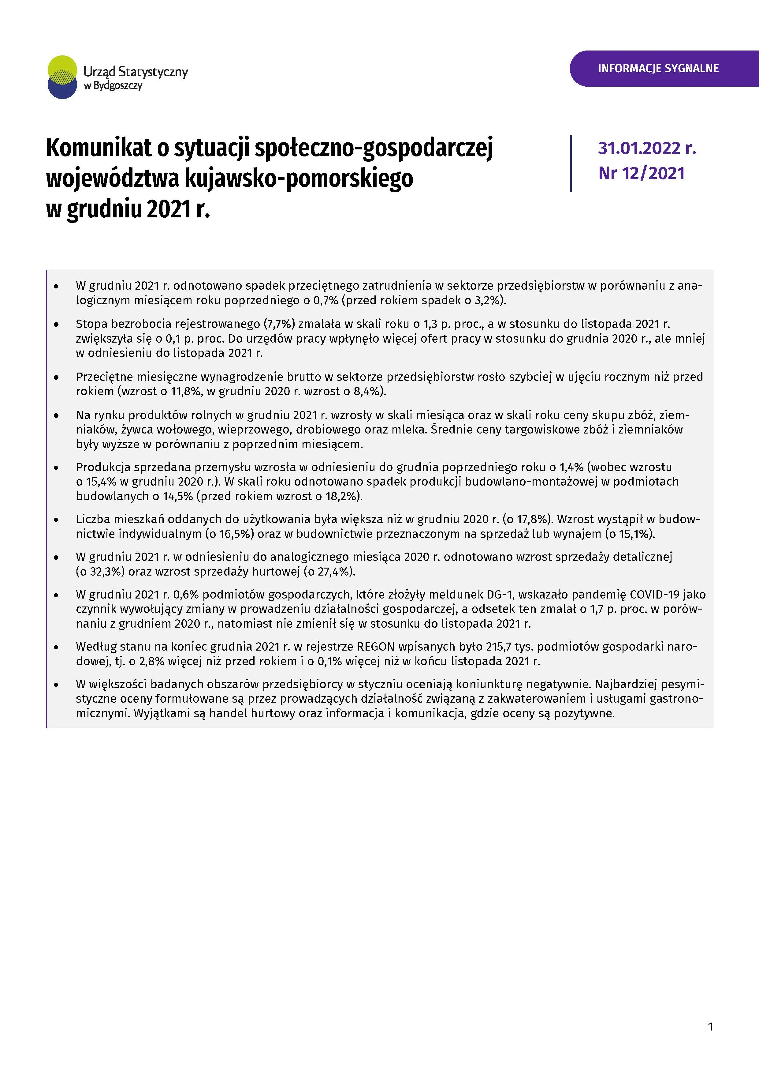 Komunikat o sytuacji społeczno-gospodarczej województwa kujawsko-pomorskiego - grudzień 2021 r.