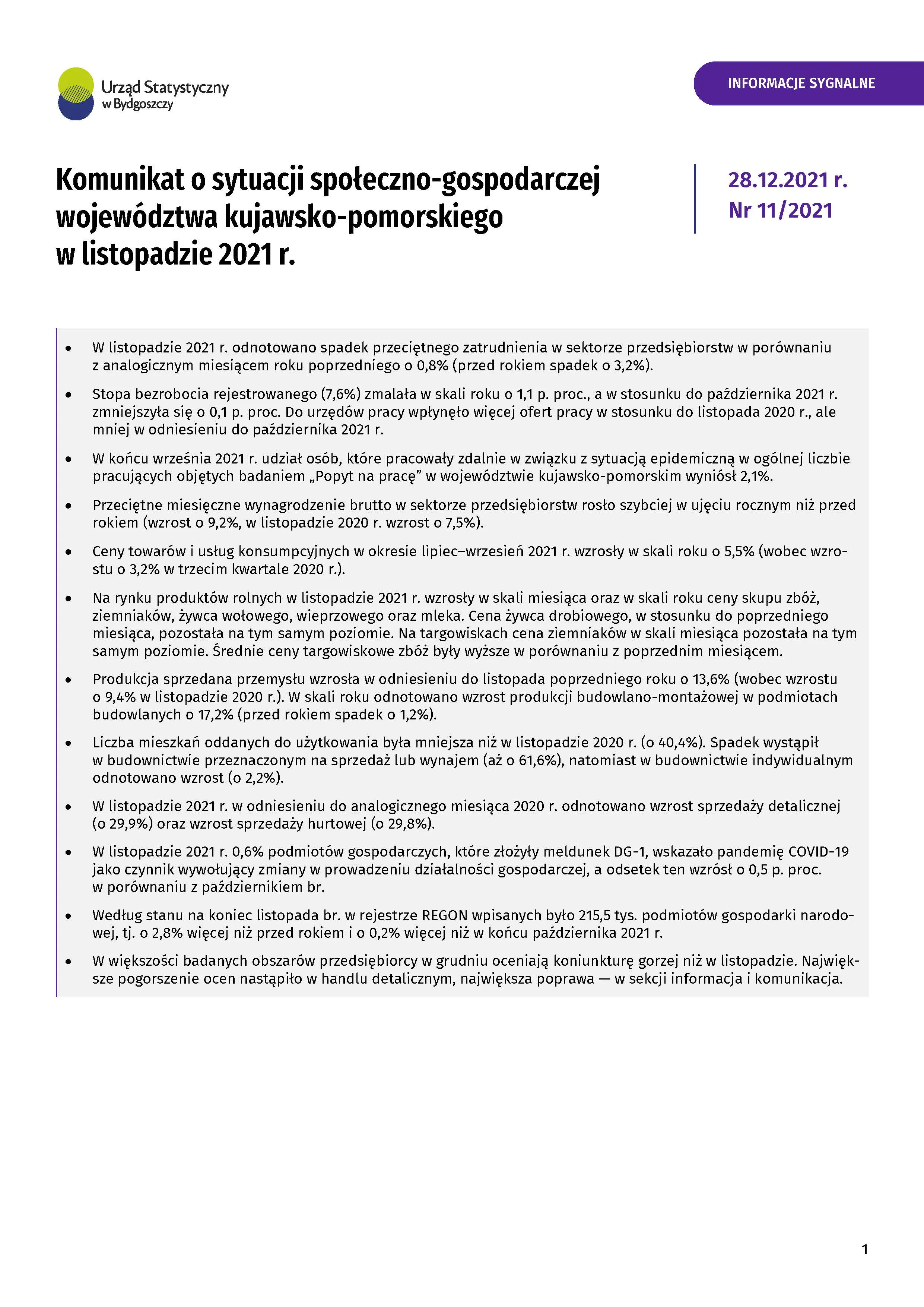 Komunikat o sytuacji społeczno-gospodarczej województwa kujawsko-pomorskiego - listopad 2021 r.