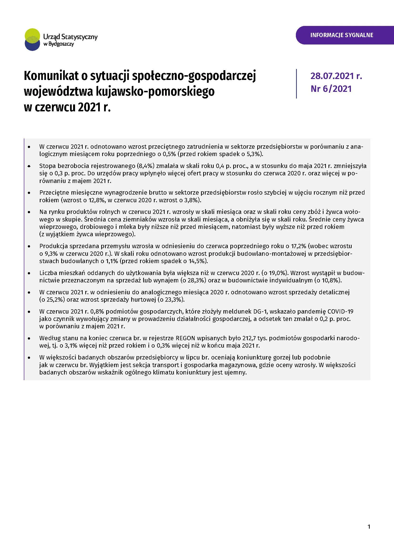 - Komunikat o sytuacji społeczno-gospodarczej województwa kujawsko-pomorskiego - lipiec 2021 r.