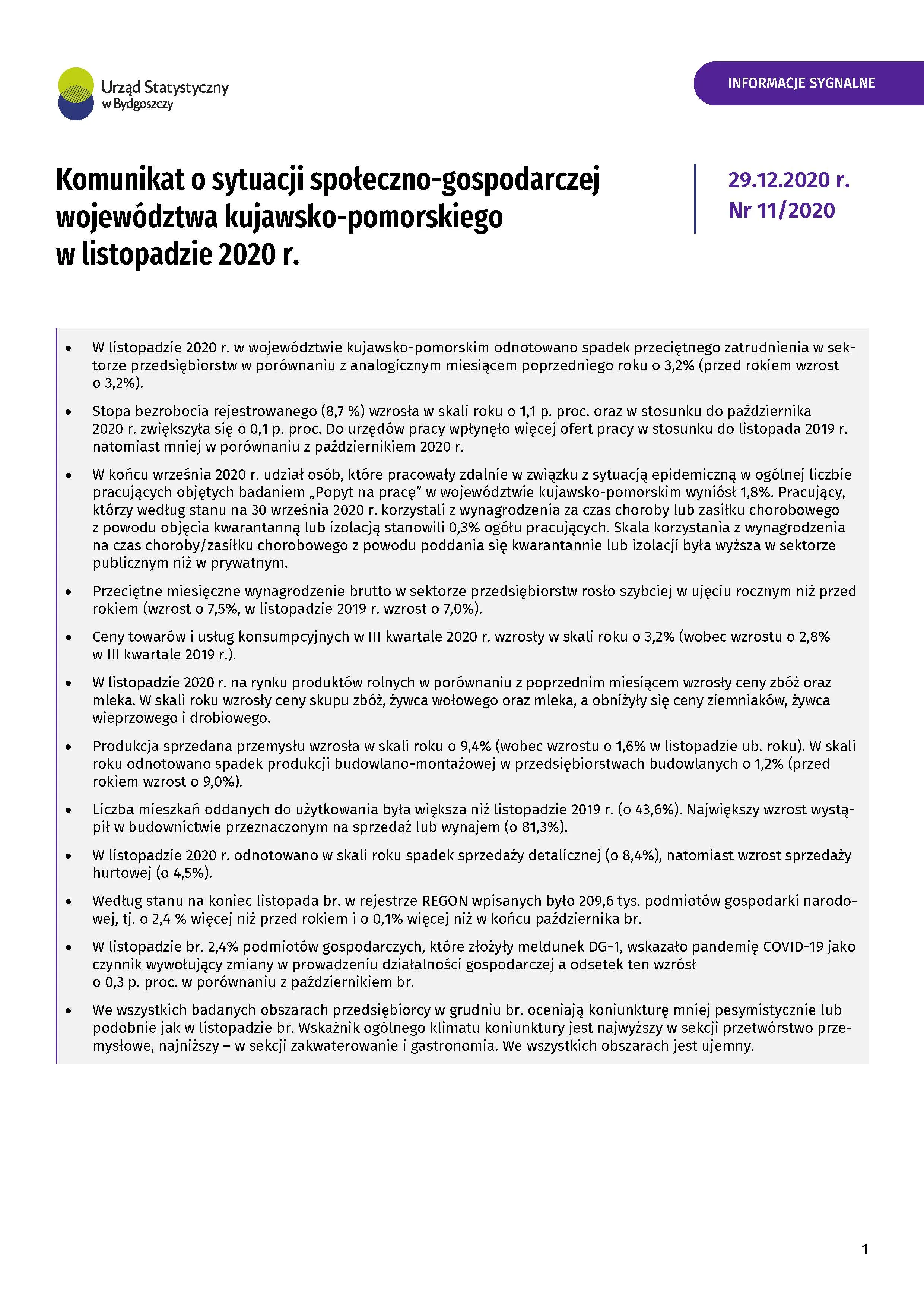 Komunikat o sytuacji społeczno-gospodarczej województwa kujawsko-pomorskiego - listopad 2020 r.