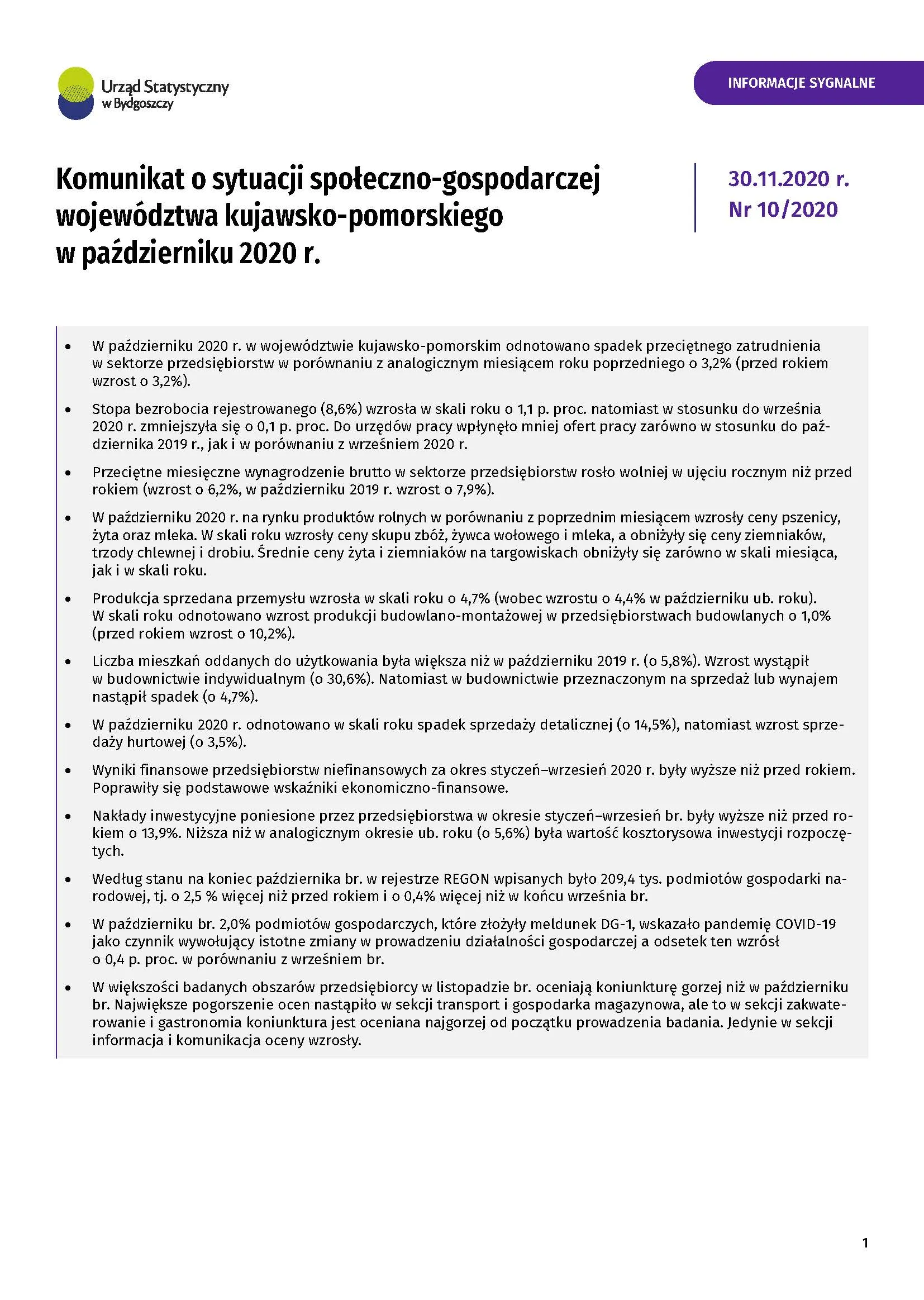 - Komunikat o sytuacji społeczno-gospodarczej województwa kujawsko-pomorskiego - listopad 2020 r.
