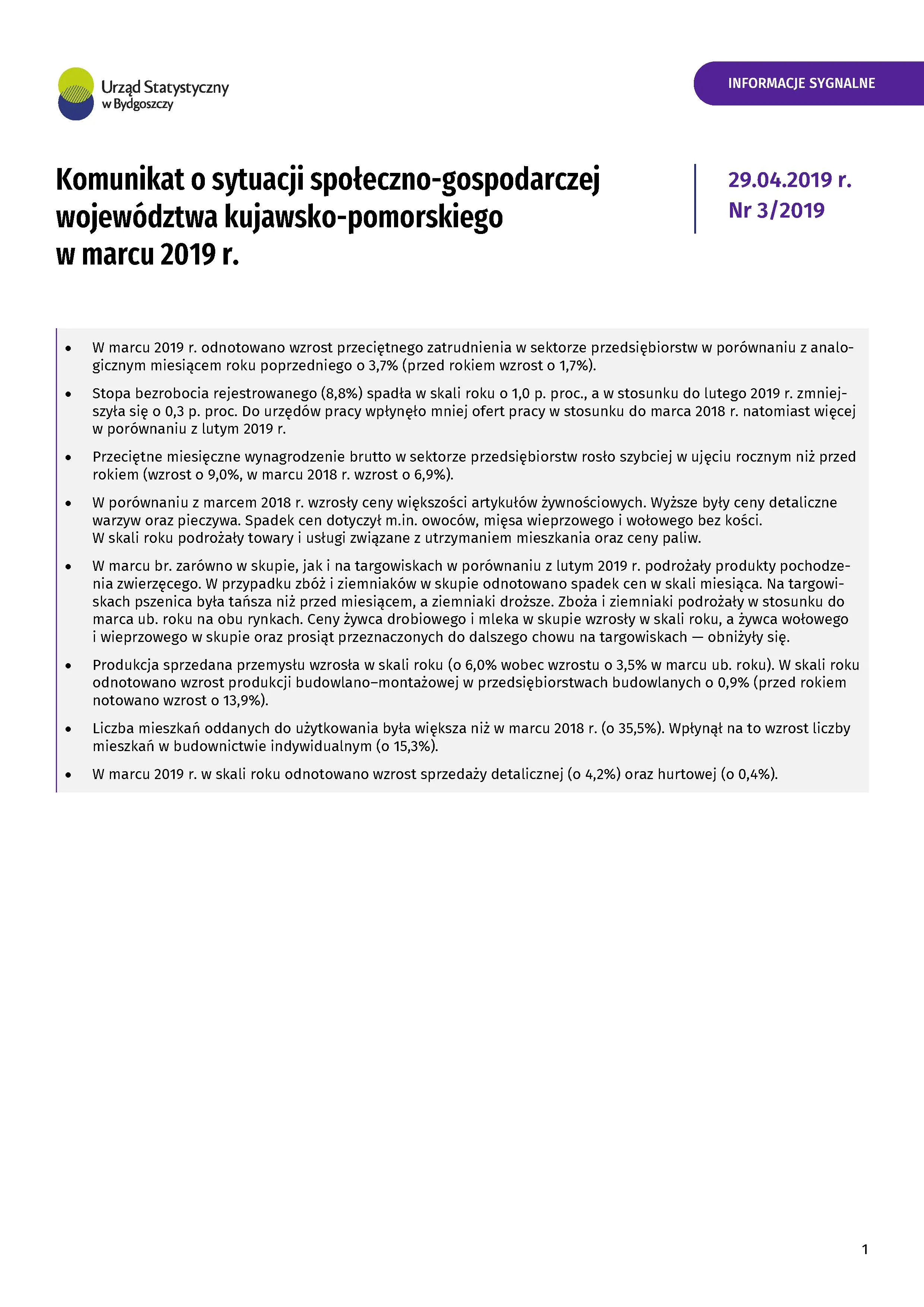 Komunikat o sytuacji społeczno-gospodarczej województwa kujawsko-pomorskiego - marzec 2019 r.