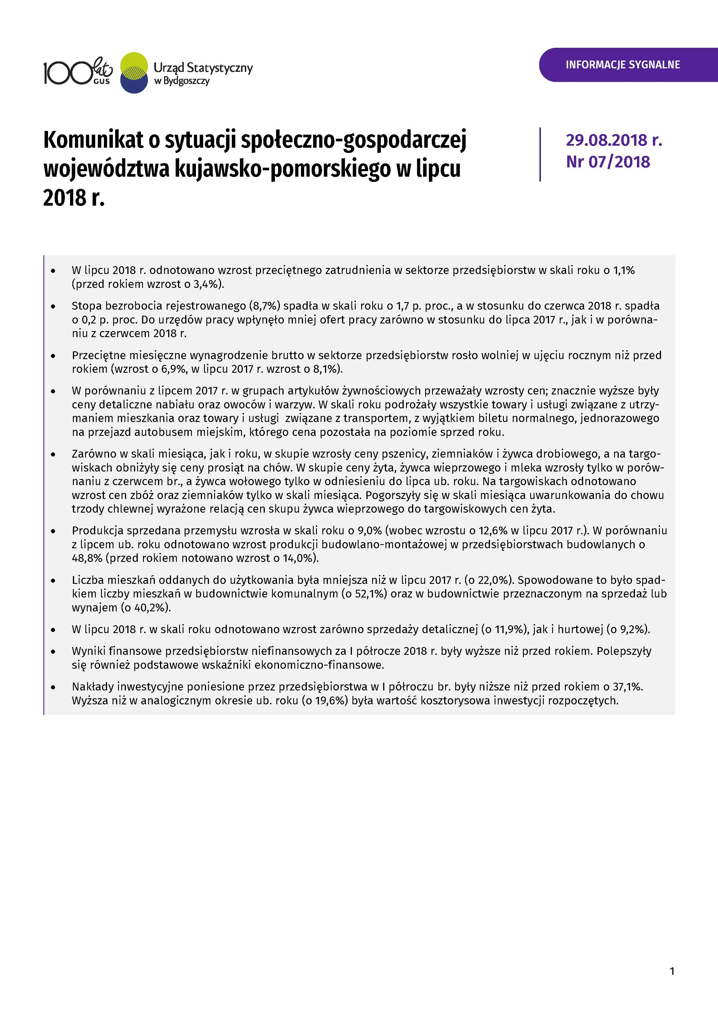 Komunikat o sytuacji społeczno-gospodarczej województwa kujawsko-pomorskiego - lipiec 2018 r.