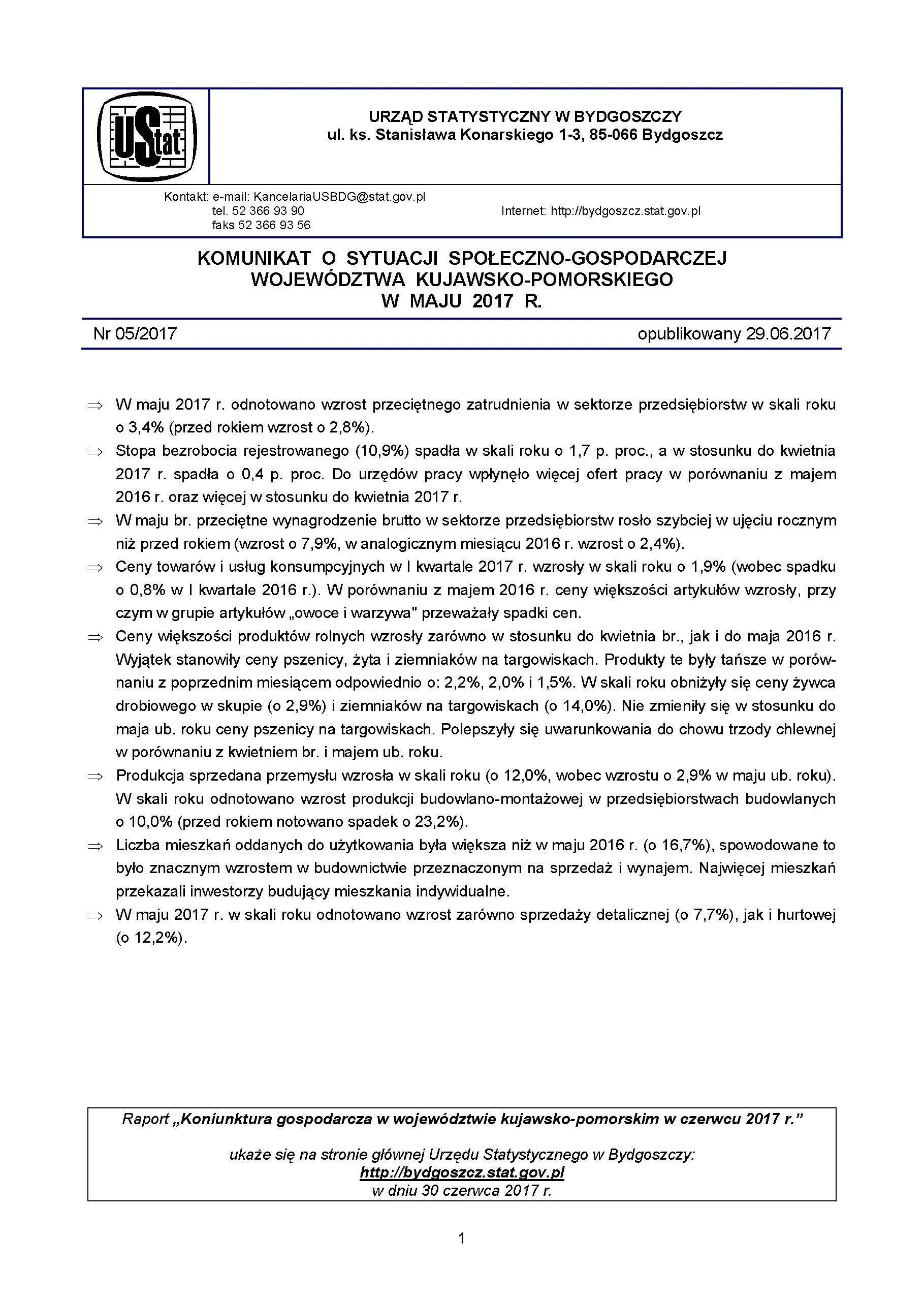Komunikat o sytuacji społeczno-gospodarczej województwa kujawsko-pomorskiego - maj 2017 r.