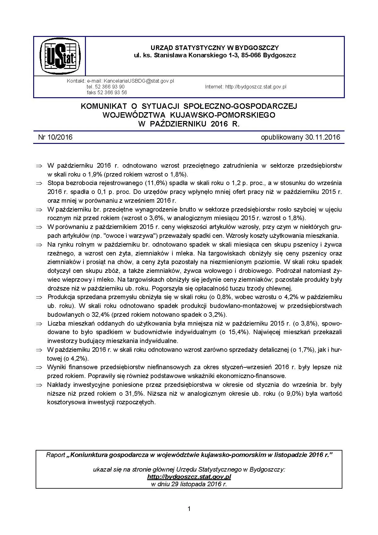 Komunikat o sytuacji społeczno-gospodarczej województwa kujawsko-pomorskiego - październik 2016 r.
