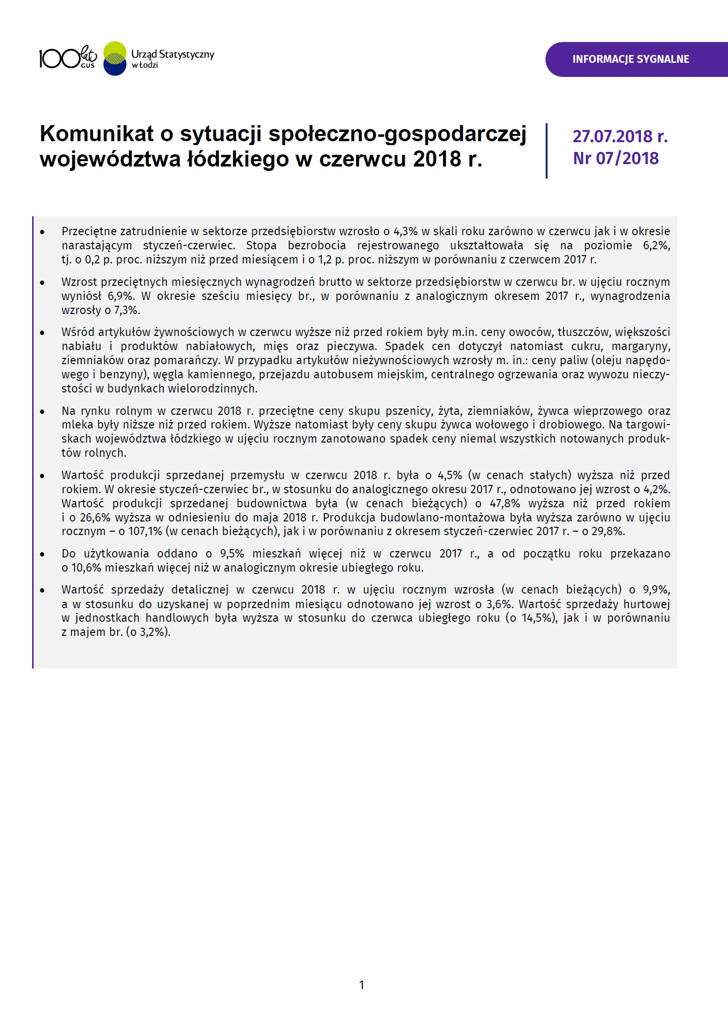 - Komunikat o sytuacji społeczno-gospodarczej województwa łódzkiego (lipiec 2018 r.)