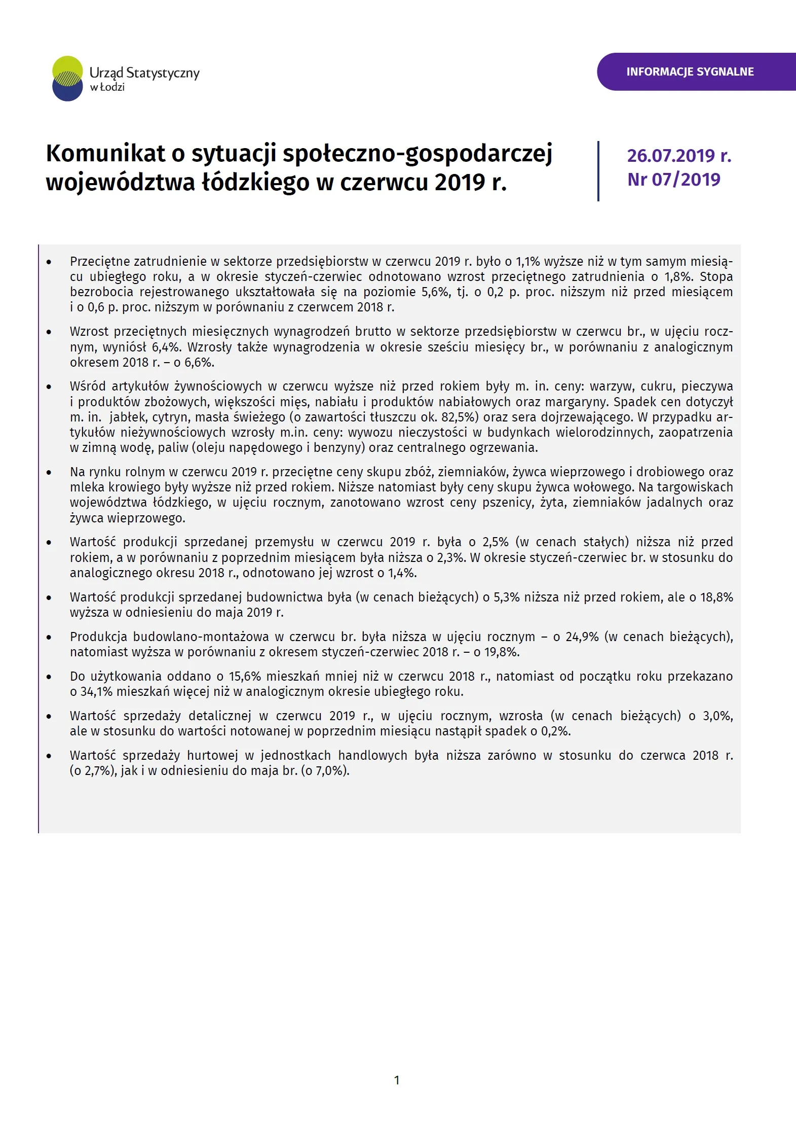 - Komunikat o sytuacji społeczno-gospodarczej województwa łódzkiego (lipiec 2019 r.)