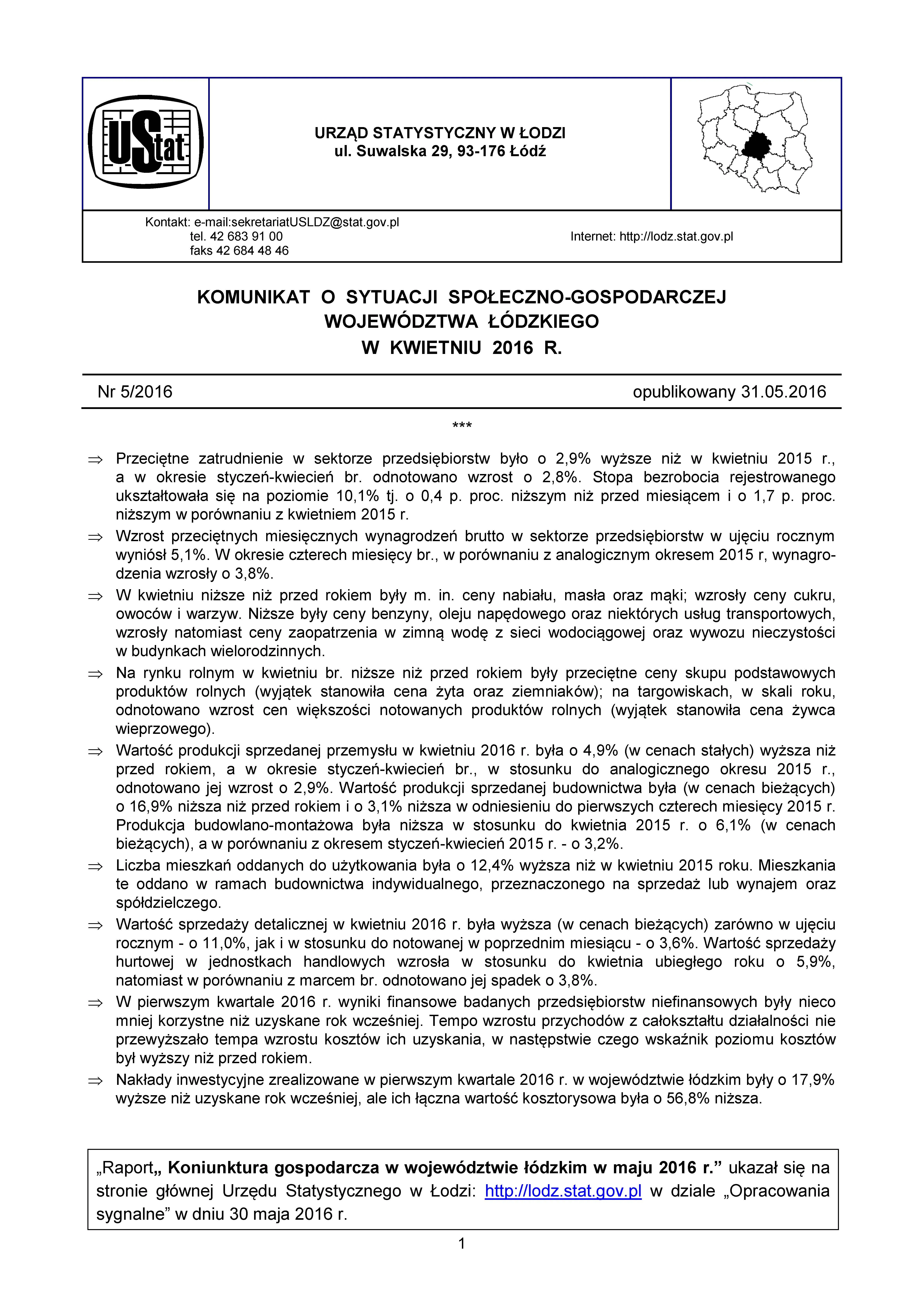 - Komunikat o sytuacji społeczno-gospodarczej województwa łódzkiego ( maj 2016 r.)