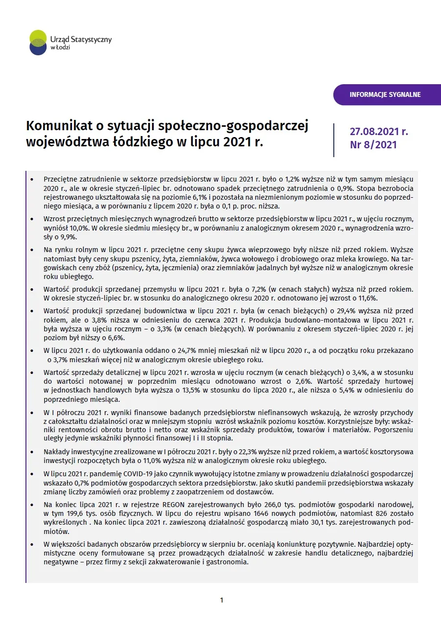 - Komunikat o sytuacji społeczno-gospodarczej województwa łódzkiego (sierpień 2021 r.)