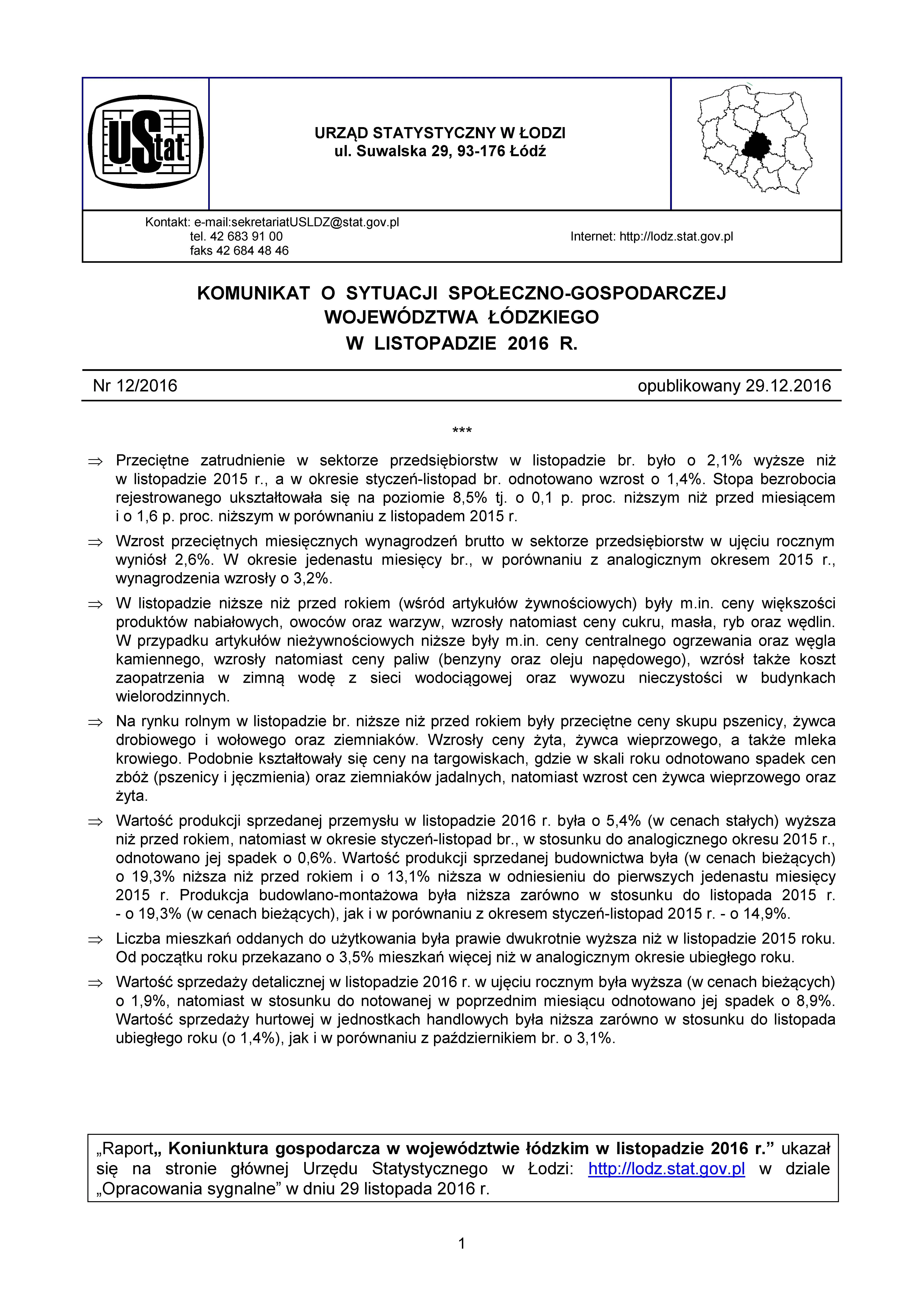 Komunikat o sytuacji społeczno-gospodarczej województwa łódzkiego ( listopad 2016 r.)