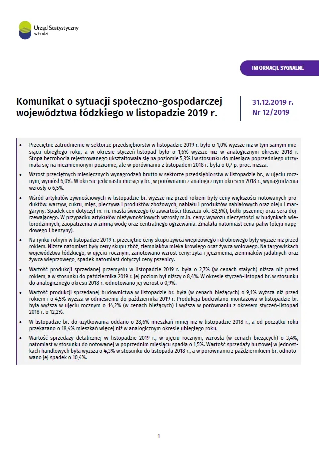 - Komunikat o sytuacji społeczno-gospodarczej województwa łódzkiego (grudzień 2019 r.)