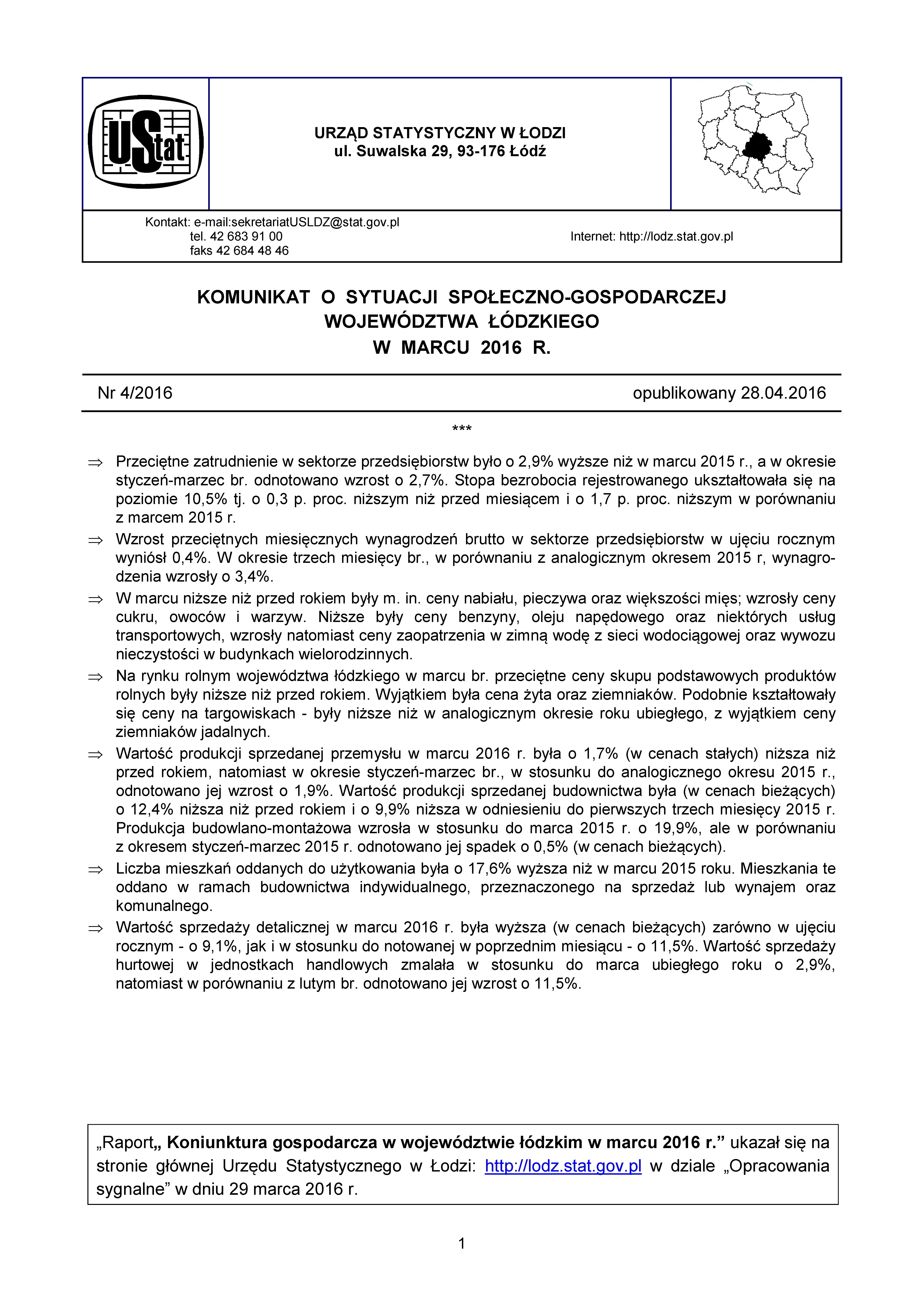 - Komunikat o sytuacji społeczno-gospodarczej województwa łódzkiego ( kwiecień 2016 r.)