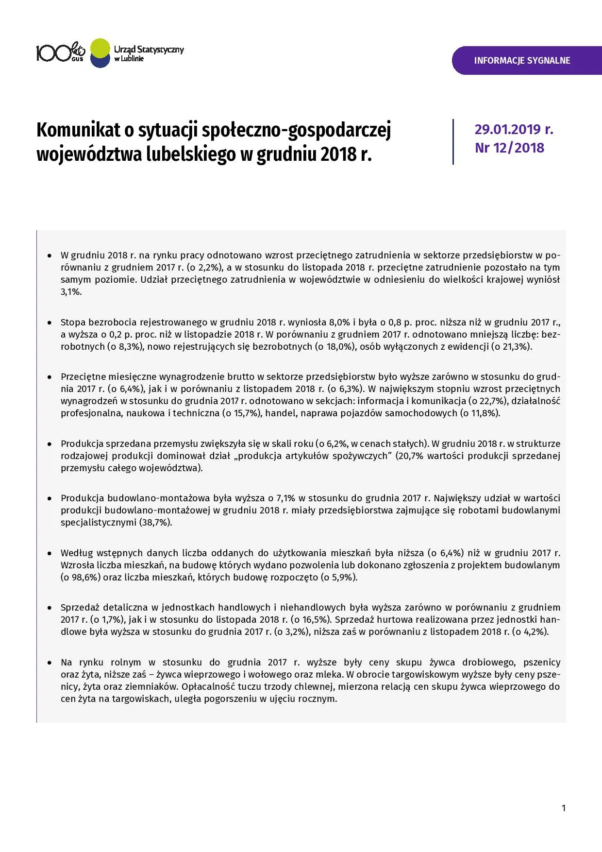 - Komunikat o sytuacji społeczno-gospodarczej województwa lubelskiego styczeń 2019 r.