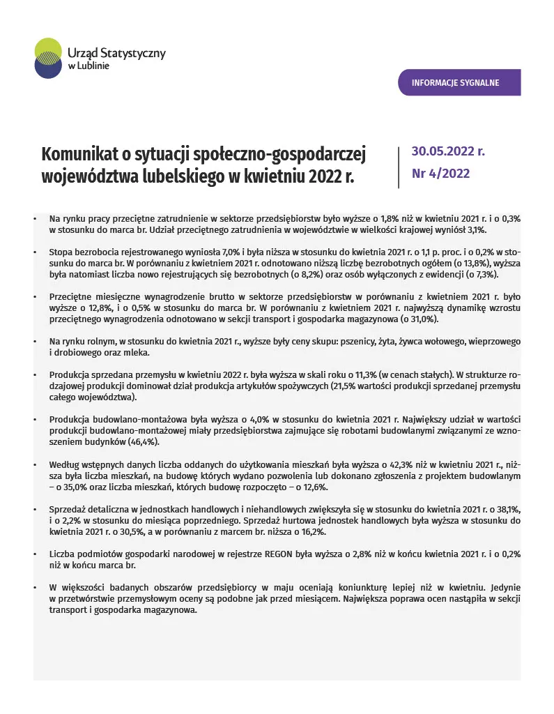 - Komunikat o sytuacji społeczno-gospodarczej województwa lubelskiego maj 2022 r.