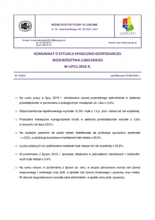 Komunikat o sytuacji społeczno-gospodarczej województwa lubelskiego lipiec 2016 r.