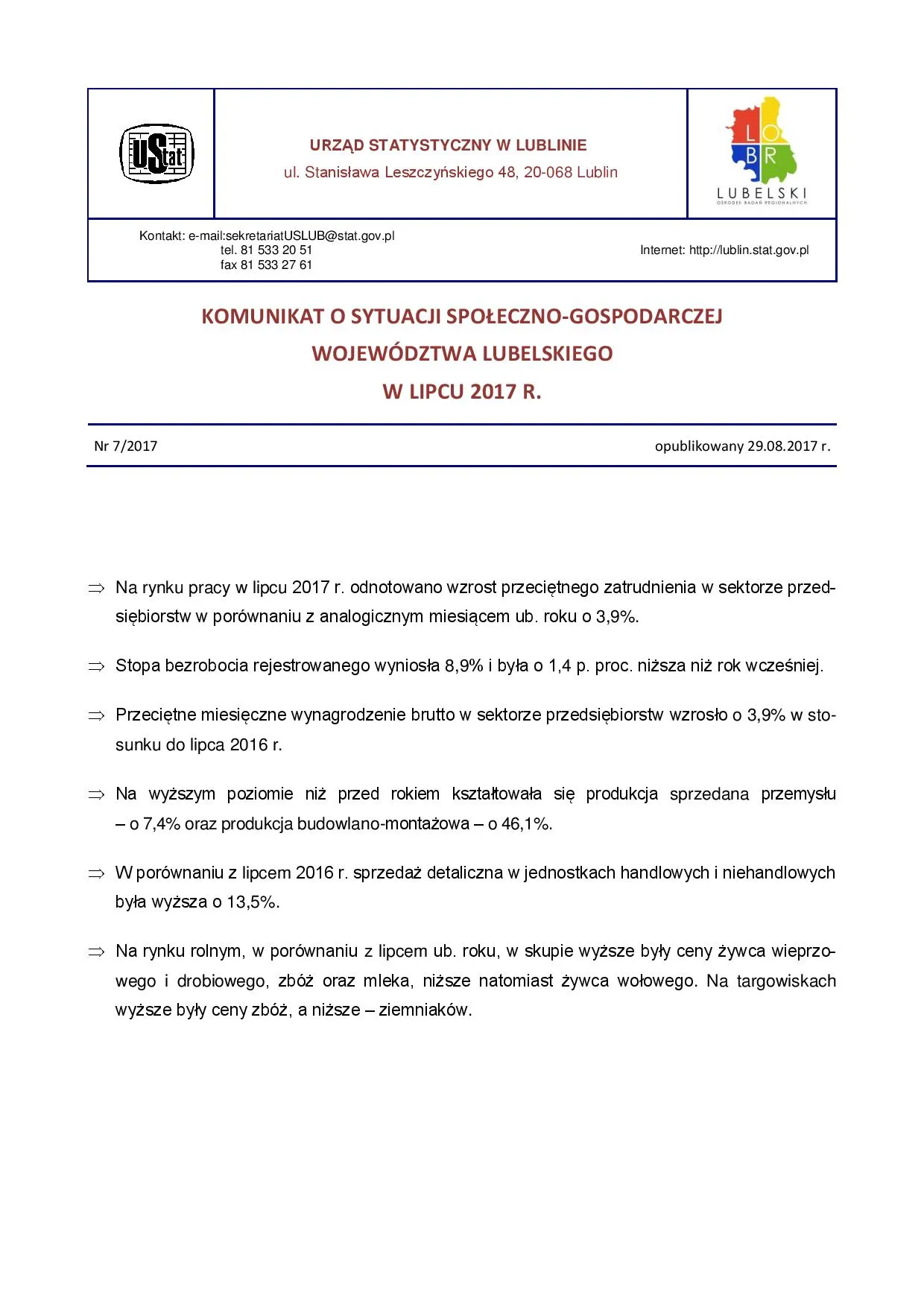 - Komunikat o sytuacji społeczno-gospodarczej województwa lubelskiego sierpień 2017 r.