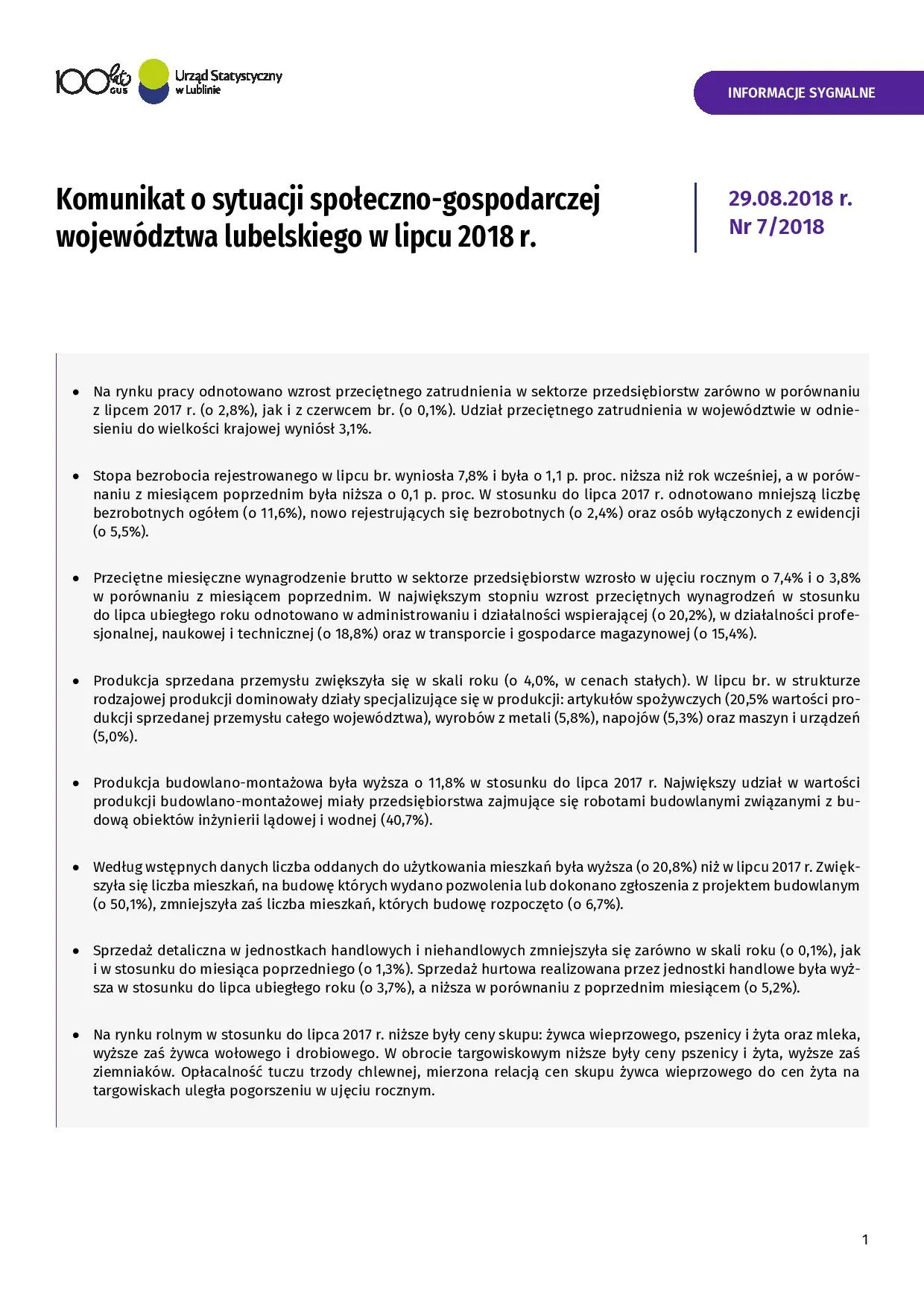 - Komunikat o sytuacji społeczno-gospodarczej województwa lubelskiego sierpień 2018 r.