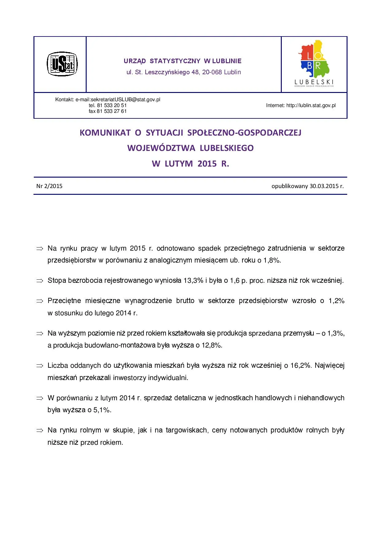 - Komunikat o sytuacji społeczno-gospodarczej województwa lubelskiego marzec 2015 r.