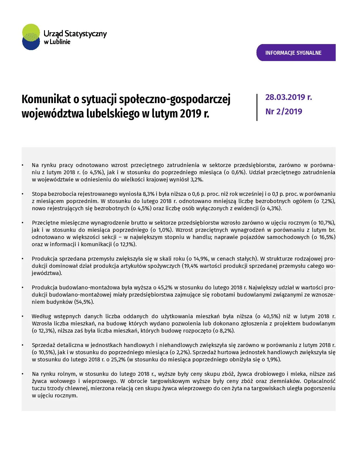 - Komunikat o sytuacji społeczno-gospodarczej województwa lubelskiego marzec 2019 r.