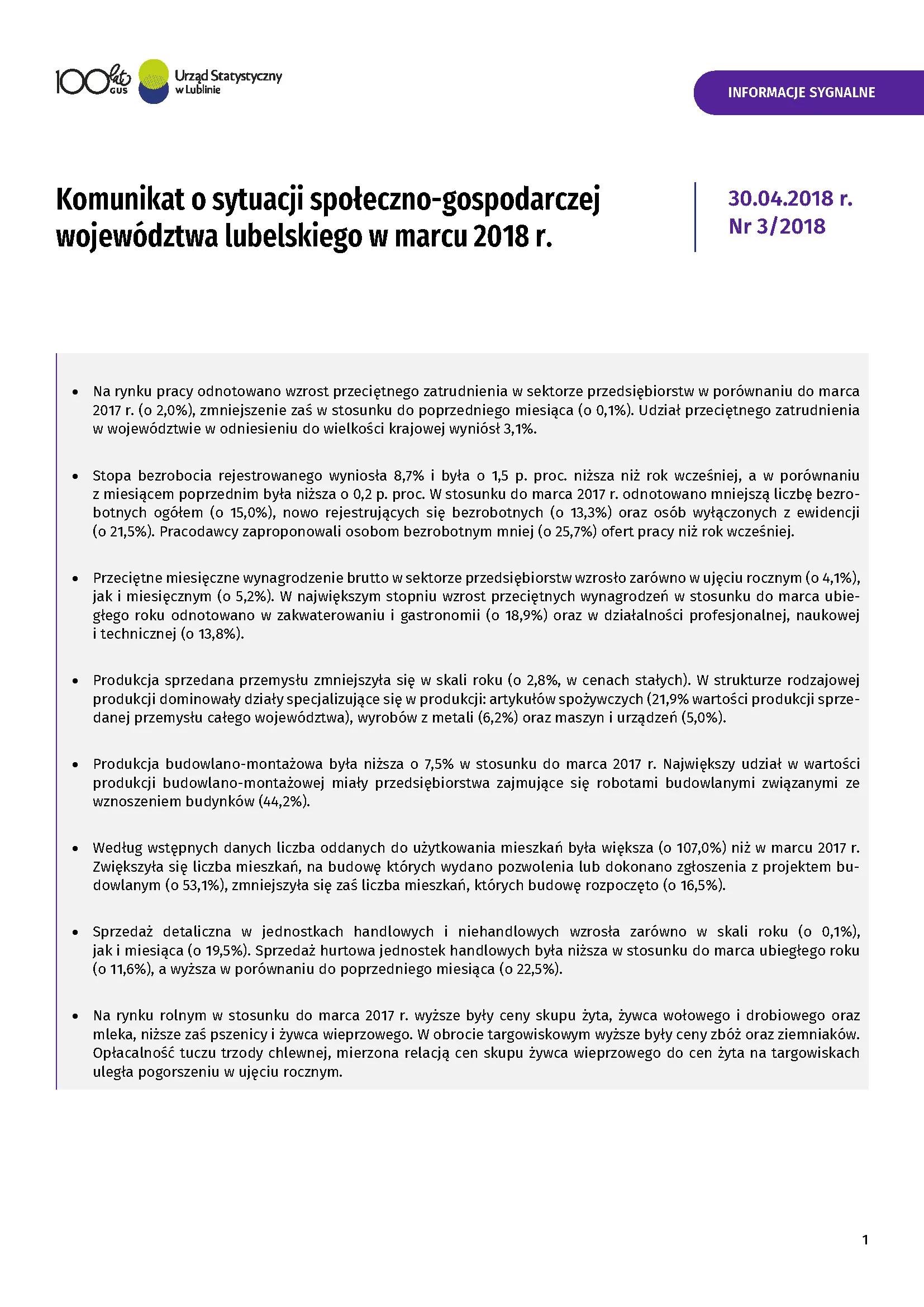 Komunikat o sytuacji społeczno-gospodarczej województwa lubelskiego marzec 2018 r.