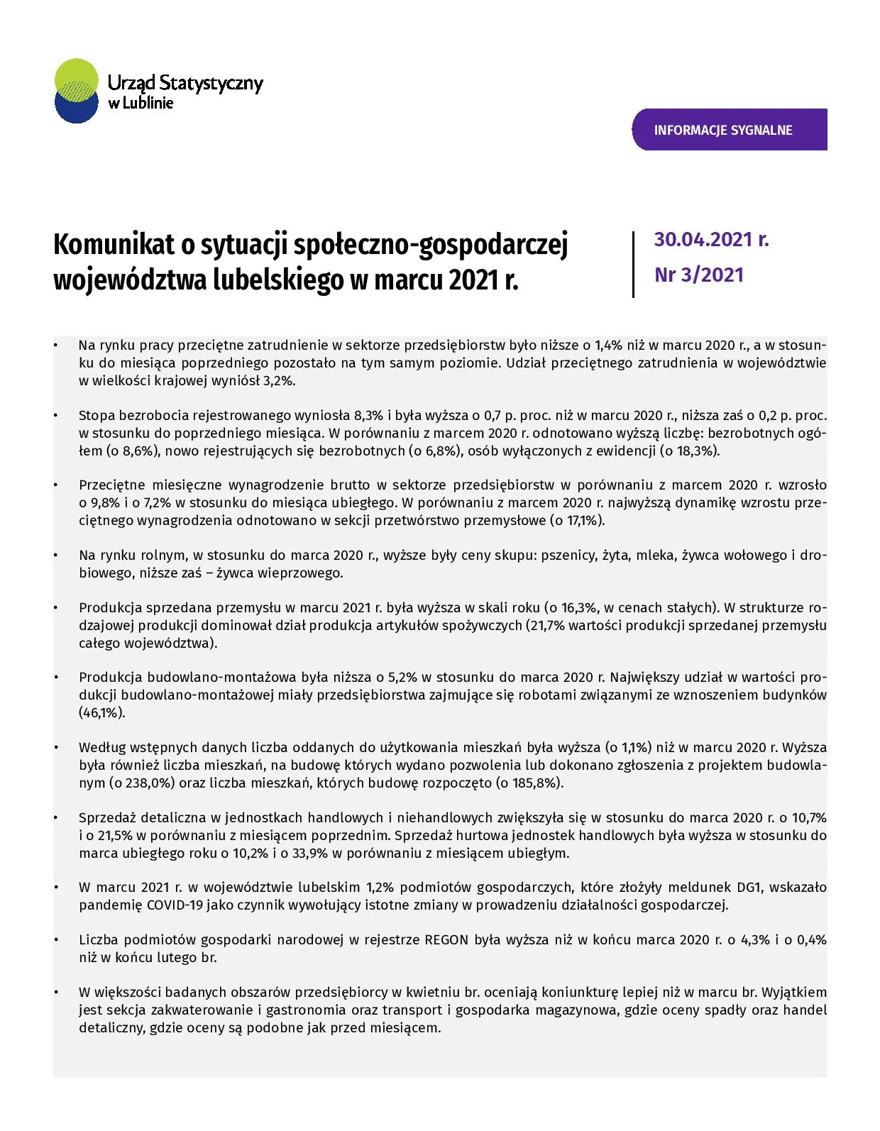 Komunikat o sytuacji społeczno-gospodarczej województwa lubelskiego marzec 2021 r.