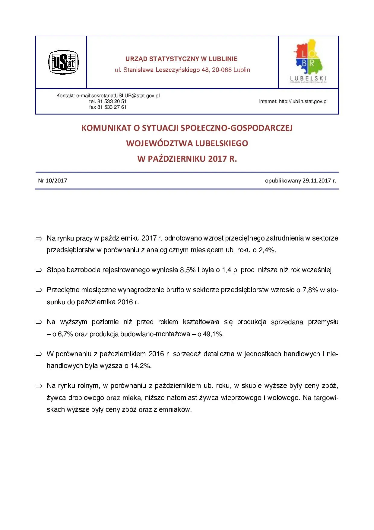 - Komunikat o sytuacji społeczno-gospodarczej województwa lubelskiego listopad 2017 r.