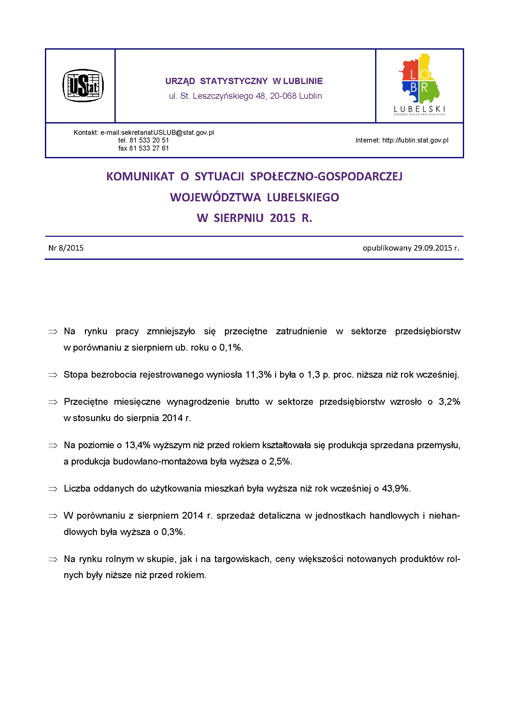 Komunikat o sytuacji społeczno-gospodarczej województwa lubelskiego sierpień 2015 r.