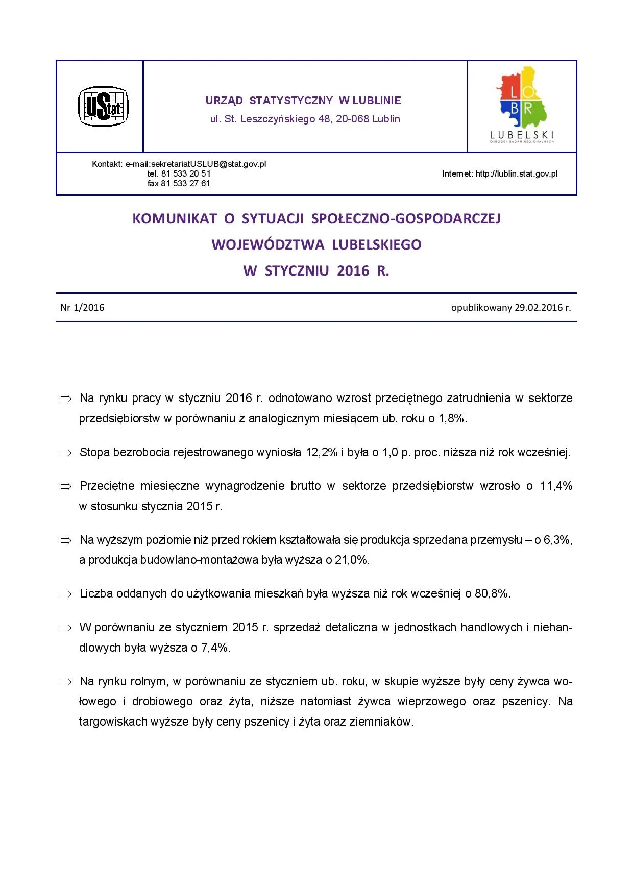 - Komunikat o sytuacji społeczno-gospodarczej województwa lubelskiego luty 2016 r.