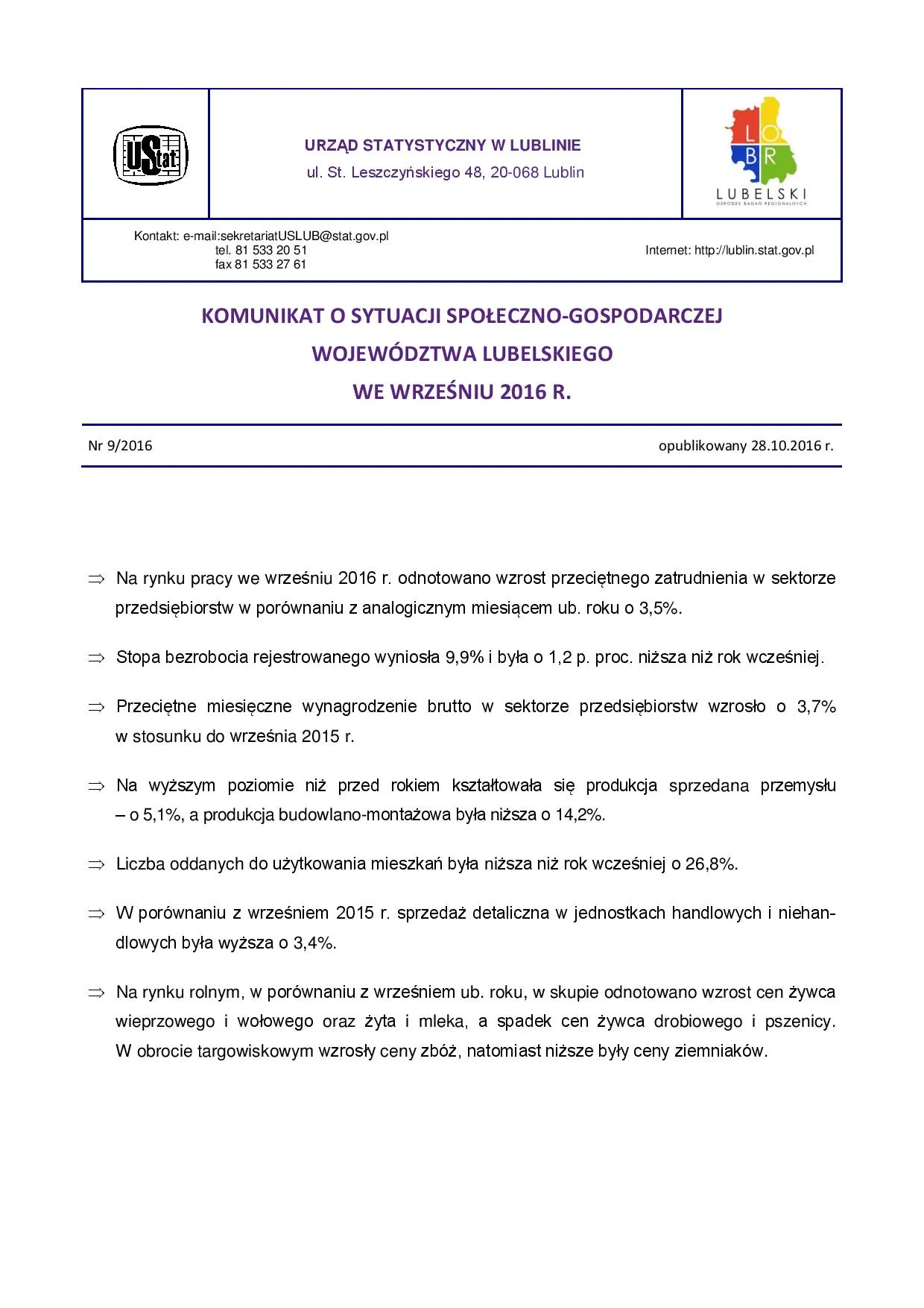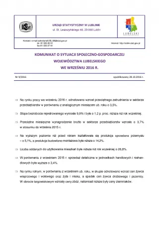 - Komunikat o sytuacji społeczno-gospodarczej województwa lubelskiego październik 2016 r.