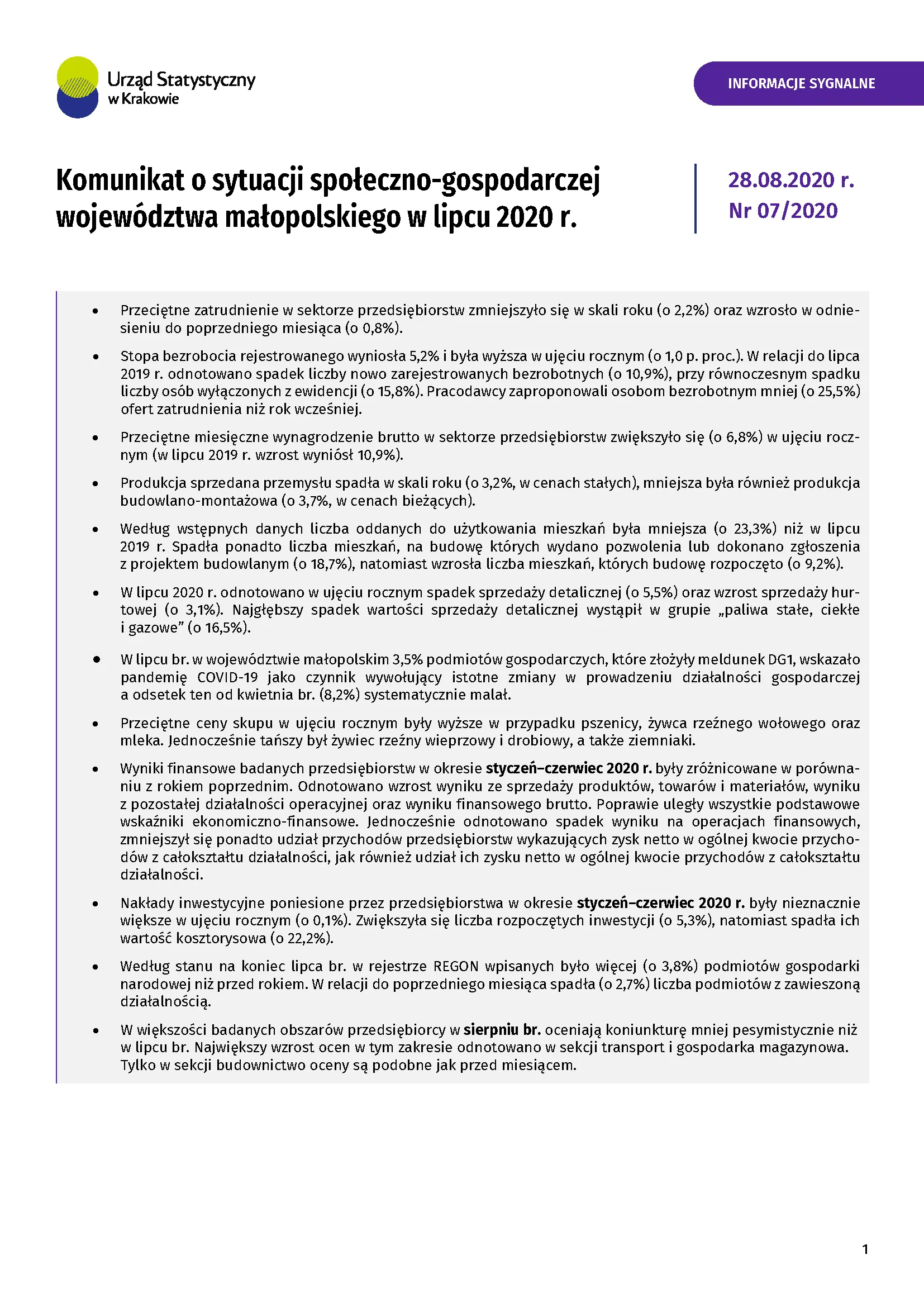 - Komunikat o sytuacji społeczno-gospodarczej województwa małopolskiego w sierpniu 2020 r.