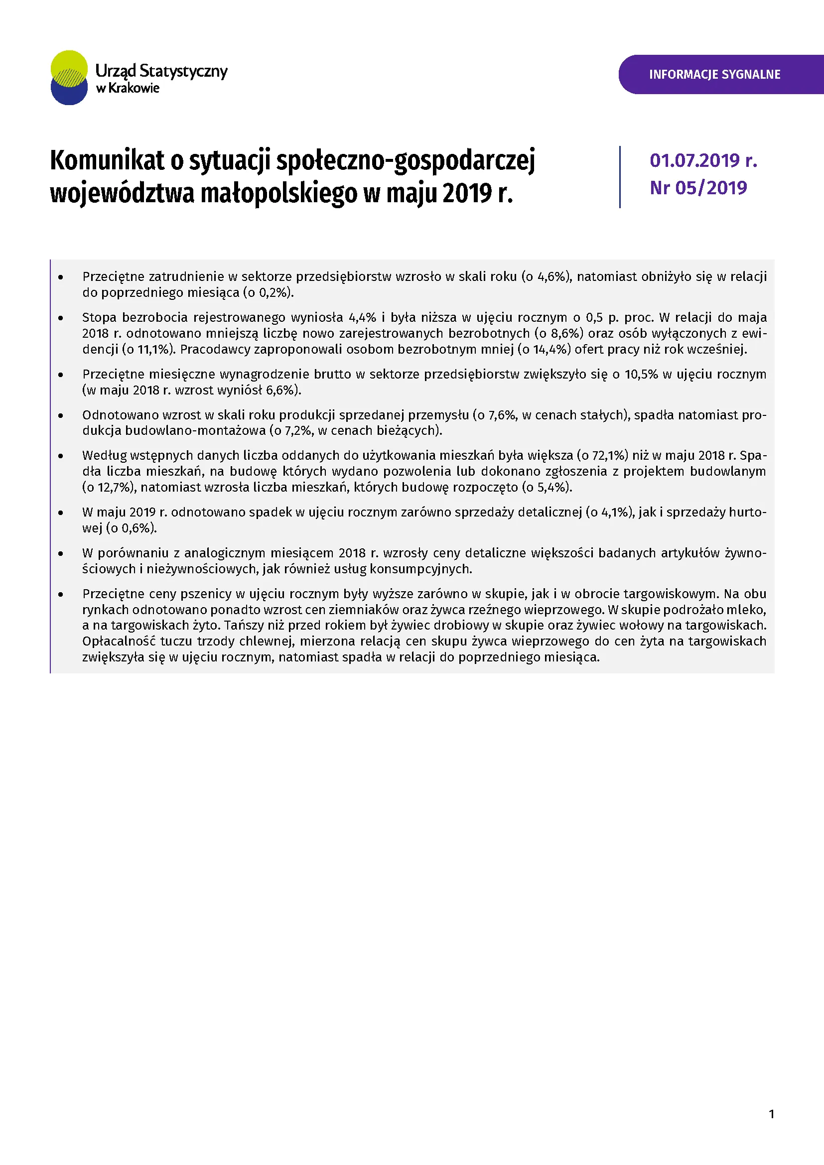 - Komunikat o sytuacji społeczno-gospodarczej województwa małopolskiego w marcu 2019 r.